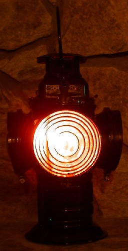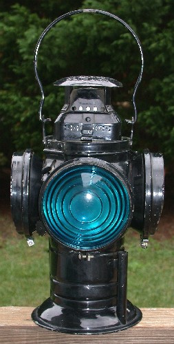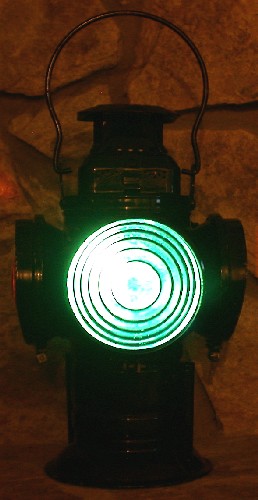 A green signal would let the train engineer know that the railroad switch was set to straight ahead. Although this lens appears aqua blue in natural light, the yellow kerosene powered flame would cause it to glow with a green hue.