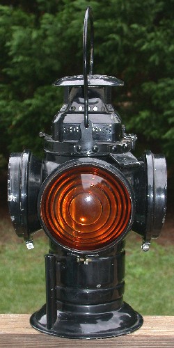 This is a railroad switch lamp made by the Adlake company. This model differs from my other ones in that it has a bellbottom design. Instead of a mounting socket on the bottom, it has a tube on each side that would fit on a fork that extended from the railroad switch mechanism.