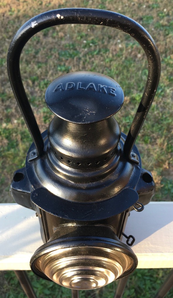 This is a Railway Motor Car Lamp made by the Adlake company. It stands about 9.5 inches tall, not including the handle. There are mounting brackets on each side that would go into a yoke style mount. The clear lens is 4" in diameter.