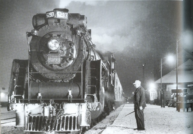 This image shows a Canadian National Railway steam locomotive being oiled in Sherbooke, Quebec. Feb. 23, 1957.