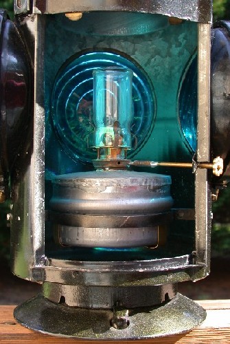 The best part about a lamp is lighting it up and watching the lenses glow. The glowing round spot between the top of the green and red lenses is the peep sight window. It allowed a user to look in and see if the flame was burning during daylight hours.