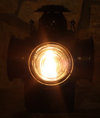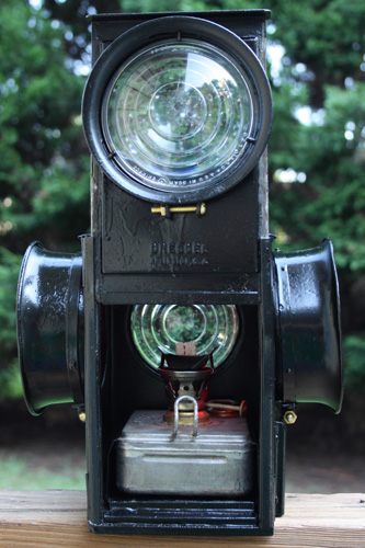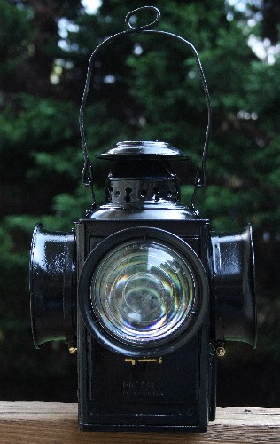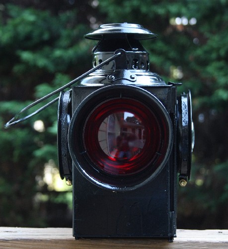This is a railroad lamp made by the Dressel company. It stands about 10.5", not including the handle. The purpose of this lamp was to serve as a marker on a manned crossing gate. Note that this lamp differs from my other Dressel crossing gate lamp in that it is four-way lamp instead of two-way. It also has a square body instead of a rounded one.