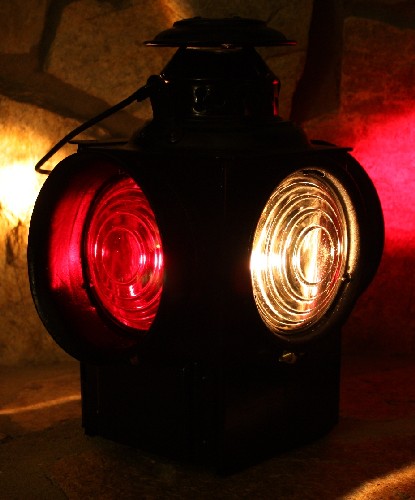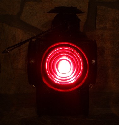 Here you see the lamp in action. There's no mistaking that bright red signal for anything other than STOP. Today's modern railroad crossings have electric lights, bells, and mechanical arms that lower with the approaching train. That's quite a contrast to this lamp, which was manually lit, maintained, and moved into place by a railroad worker.