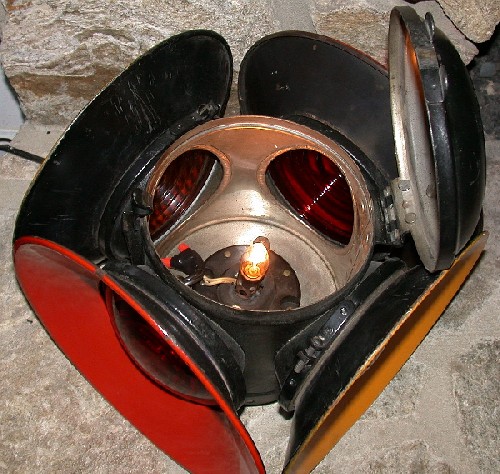 This is a Dressel Stainless lamp. The lenses are red and amber and about 5" in diameter. The plates, or targets, are about 10" in diameter. The purpose of the targets is to allow the lamp to be used more effectively during the daylight hours.