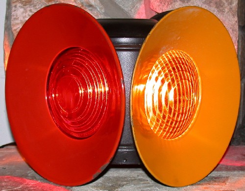 Notice in the title of the webpage that I refer to this as a derail lamp. I'm doing so because sometimes derail lamps used these combinations of colors. In a regular regular switch lamp, the colors would be red and green (main line use), or green and amber (rail yard use). A combination of red and amber would sometimes indicate its use in derailing operations. A derail was a device placed on top of the railroad track that would cause a railcar to derail. Yes, that's right, it would cause a railcar to come off of the track. It was a safety measure to keep loose cars from getting onto another line and having a collision. You wouldn't want a railcar from a siding just sitting on the mainline track when another locomotive comes barreling by! The lamp was an indicator as to what position the derail device was in. Red indicated that the derail device was on the track, and rail cars would derail if they passed that point. Amber indicated that the derail device was not on the track, so railcars could safely pass through that point.