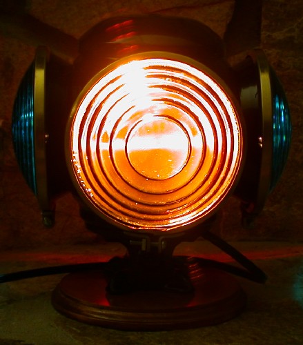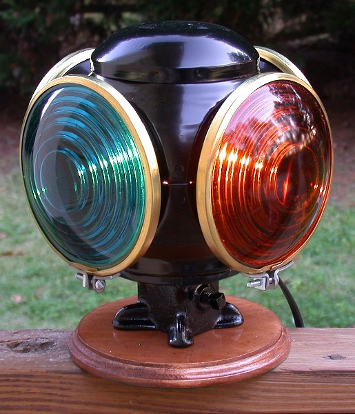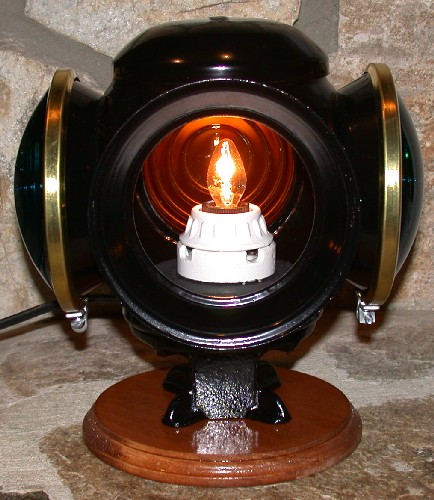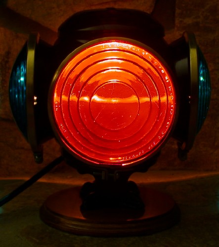 This particular lamp was constructed from an Adlake reflex lamp shell that I somehow ended up with. I've added regular switch lamp lenses that require internal illumination to work. It has three colors represented, signal green, red, and amber. I've installed an electrical socket inside that takes a C7 Christmas style light bulb. This is more than enough to really make it shine. The light socket and the wiring was done without physically altering the lamp. You see a lot of lanterns and lamps that have been electrified by drilling holes for the light sockets and wiring. I'm very much against this type of alteration and think it ruins the lantern/lamp. The coupling rings are brass to dress it up a bit. I got these from the Krise Depot. I've also mounted it to a wooden platform that I purchased from a craft store and stained. I've glued some felt on the bottom so that I could use the lamp as a display on about any surface.