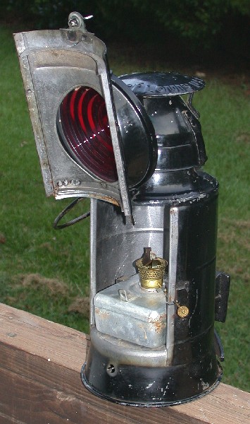 The panel that holds the lens has a hinge on top that allows the panel to flip up. This gives you access to the fuel fount and burner. The fount on this lamp is not as big as those on the switch lamps because this lamp wasn't intended to burn as long, unattended. Plus, given that these were on the back of a caboose, and a caboose was occupied, there was always someone available to service the lamp.