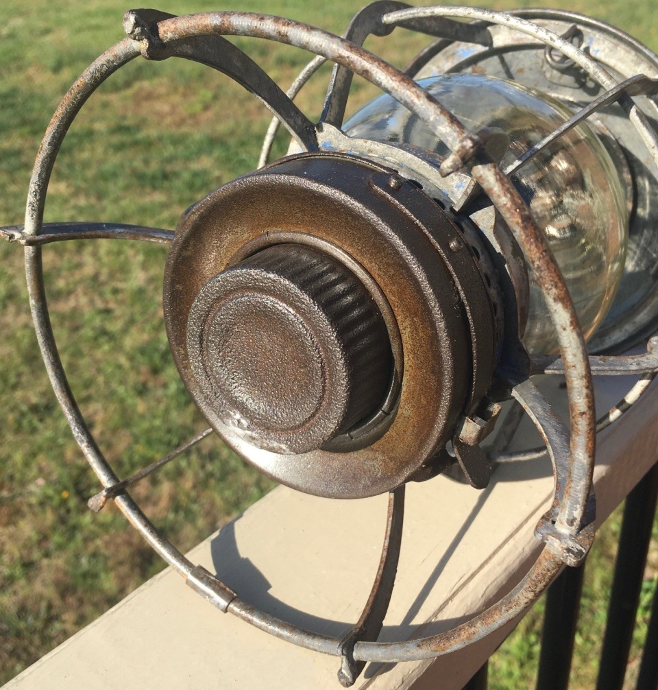 The wick of most lantern burners are adjusted up and down by a little knob attached directly to and beside of the wick. The Casey lantern is unique in that the wick height is adjusted by turning a larger knob on the bottom of the lantern. This large knob is actually part of the fuel fount.