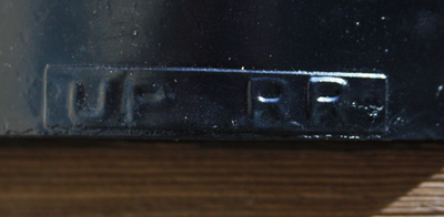 This is a slow order lamp made by the Handlan Buck company. It stands about 13 inches tall (not including the handle). The single yellow/amber lens is about 4.5" in diameter. This particular lamp was used on the Union Pacific Railroad as you can see by the small attached "UP RR" tag on the front. This lamp would have been used in conjunction with a blue (signal green) resume speed lamp.