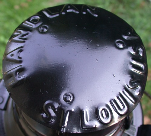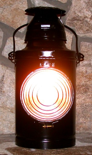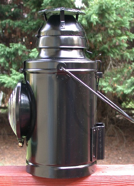 This is a tender lamp made by the Handlan Buck company. The tender, or coal car as some call it, provided the fuel for the steam engine. The lamp stands about 14.5" tall, not including the handle. The single clear lens is 5 3/8".
