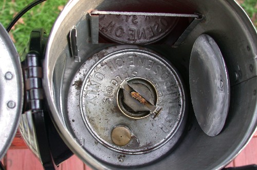 Inside the lamp you see the round fuel fount and burner. At the back of the lamp is a mirrored reflector to reflect the light back toward the front, and out the lens. The lamp is also designed with slots directly behind the lens, and on the side. A piece of red colored glass was inserted into the slots. The slots on the side were used for storage. The slots directly behind the lens were used to change the color of the signal from white to red.