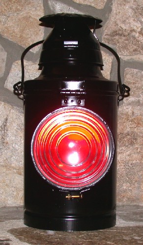 This lamp was used on the back of a steam engine tender (i.e. coal car), and attached by the bracket you see in the first image. I'm told that this style lamp was used by the Missouri-Kansas-Texas Railroad (MKT) and the Pennsylvania Railroad (PRR). When an engine and tender were traveling in the forward direction, it would need a red tail marker lamp on the back. The red piece of glass was removed from the side storage slots and placed in the slots directly behind the lens. This red glass between the light source (i.e. the kerosene flame of the burner) and the lens would cause a red signal to be shone outside of the lamp, as shown in the above, second image.