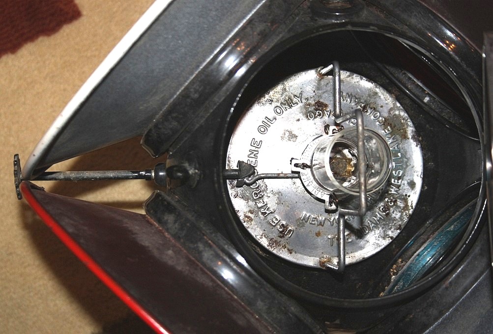 Here's a view of inside the lamp, looking from the top. You can see how the outside wick adjustment knob connects with the inside burner. It is spring loaded such that you can pull it back slightly to insert and remove the fuel fount. Also it's extra long on this model such that it extends outside of the day targets for easy use.
