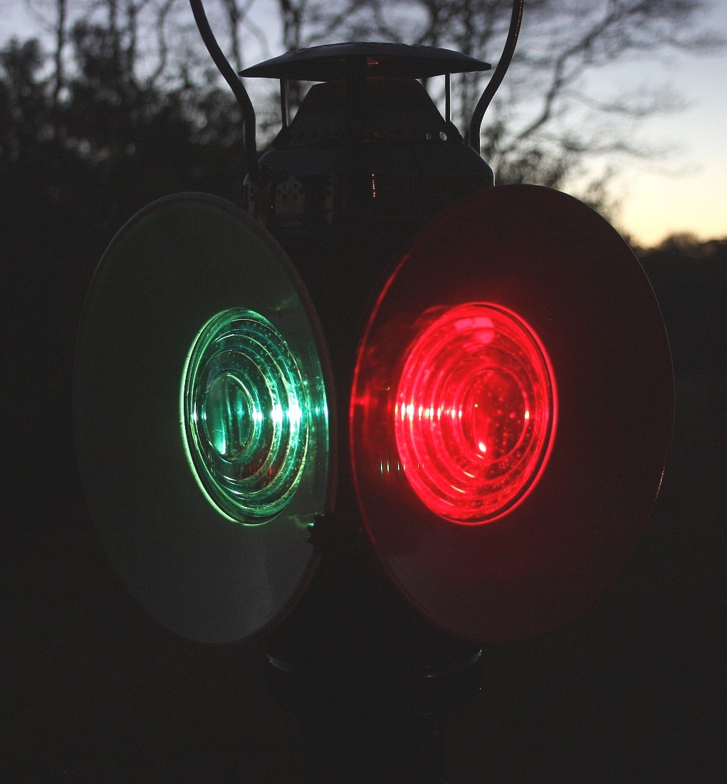 Here's a timed exposure with the lamp lit. The glow of red and green lenses are quite beautiful. The blue lens shines a signal green, indicating that the switch is set to straight ahead. A red signal showing would indicate that the rail switch is set to the siding. Since there are no railroad markings on this lamp that I can find, I have no way of knowing which railroad it was used on.