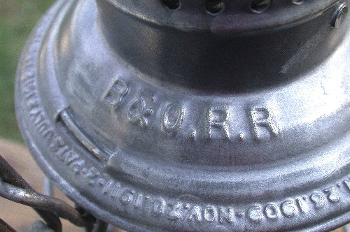This is an Adlake Reliable lantern for the Baltimore & Ohio Railroad. The lid is embossed with B&O RR. It has a clear globe used for general signaling. This lantern is a single wire guard design (i.e. it has one horizontal wire guard around the globe). My other B&O tall globe lantern is a double wire guard design.