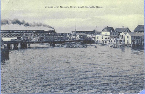 Postcard showing a New Haven train crossing the Norwalk River, South Norwalk, CT. 1914.