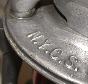 This Dietz Vesta lantern was used by the New York Central Railroad. The frame of the lantern is stamped N.Y.C.S. The red globe is cast with NYCS. That stands for New York Central System. The red globe means it was used as a stop signal.