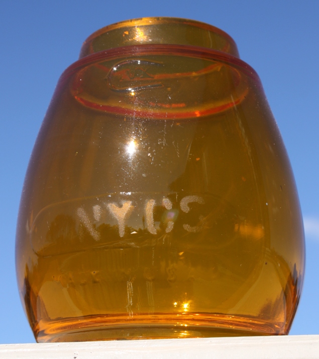 The amber globe (officially yellow) is also etched with N.Y.C.S. This color globe is a little harder to find than the clear or red ones. The amber/orange globe means it could have been used to mark camp cars (for workers staying overnight), or for notifying the train engineer that there were Form 19 orders to pick up. Form 19 orders are "hooped" (affixed to a stick with a hoop on it that the engineer could put his arm through to grab it) up to the engineer and conductor once the train is underway. People tending the railroad track switches also used amber globed lanterns for signaling.
