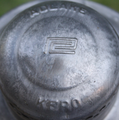 This Adlake lantern was used by the Penn Central Railroad. The top of the lantern is stamped with a C within a P (i.e. PC), the logo used by the Penn Central. The blue globe means it was used to mark equipment that was not to be moved.