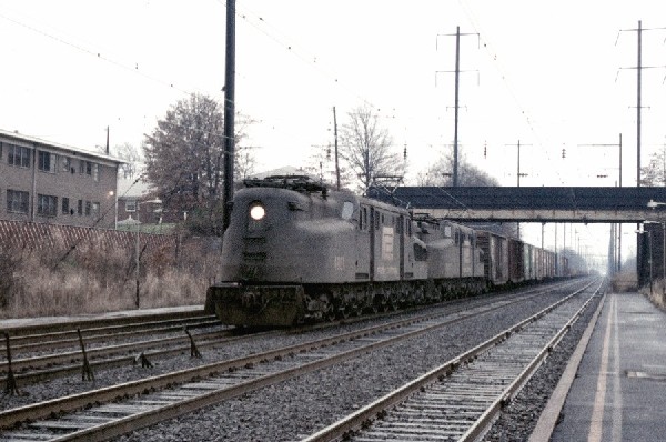 A couple of Penn Central GG1 electric locomotives. North Elizabeth, NJ. December of 1975.