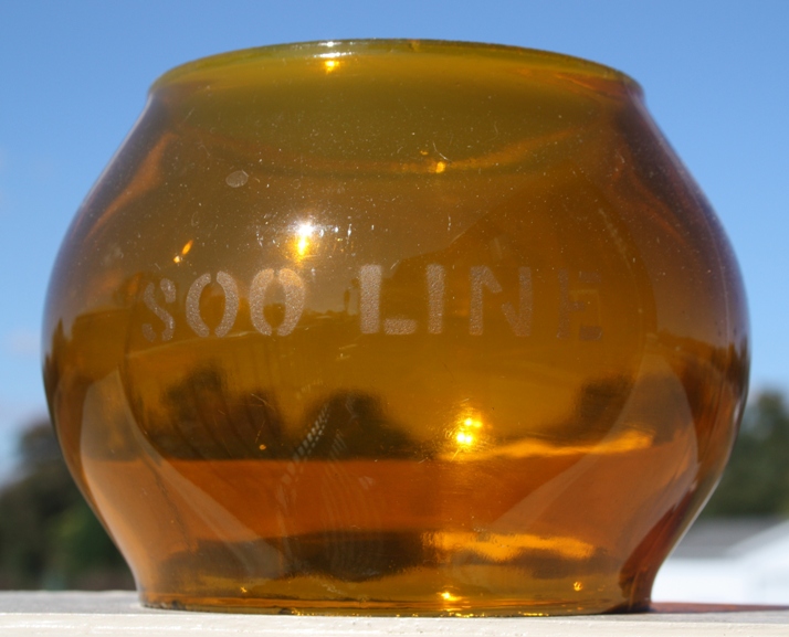 The amber globe (officially yellow) is also etched with SOO LINE. The amber/orange globe means it could have been used to mark camp cars (for workers staying overnight), or for notifying the train engineer that there were Form 19 orders to pick up. Form 19 orders are "hooped" (affixed to a stick with a hoop on it that the engineer could put his arm through to grab it) up to the engineer and conductor once the train is underway. People tending the railroad track switches also used amber globed lanterns for signaling.