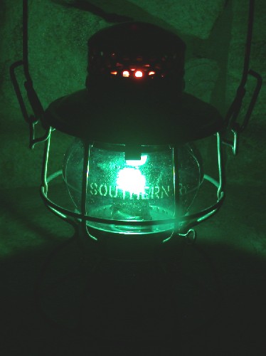 The aqua-blue globe is etched with SOUTHERN RY. The globe shines as signal green when lit. It was used as a "proceed with caution" tower signal, or by those tending the switches, or by a wreck master